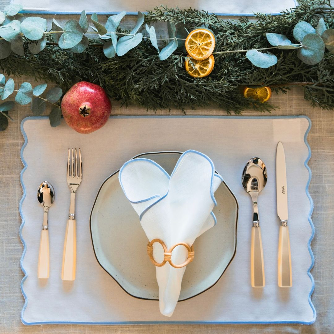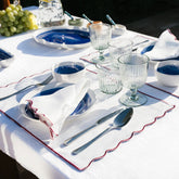 Hand-embroidered linen-cotton placemats with scalloped edges for setting a refined table.